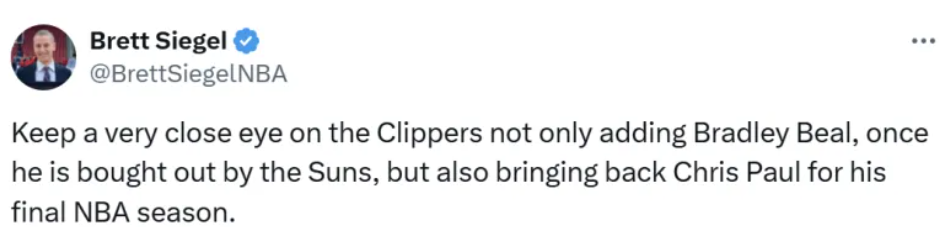 根据NBA记者Brett Siegel的报道,快船很可能同时签下保罗+比尔,比尔可以拿530万中产特例,然后快船可以给保罗底薪合同。