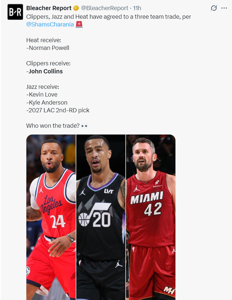 北京时间7月7日晚,热火、爵士、快船完成了一笔三方大交易,鲍威尔去了热火 ,科林斯去了快船,乐福、李凯尔、快船的2027年次轮签去了爵士,这笔交易让洛杉矶快船队得到了一个真正意义上的四号位。
