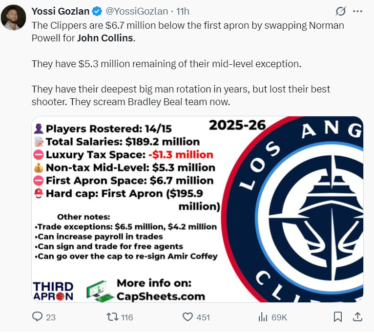 根据薪资结构专家Yossi Gozlan的分析,快船队在这笔交易后,他们的总薪资已经低于第一奢侈税线650万美元,这使得快船有一份价值530万的中产特例可以用于继续签约补强。